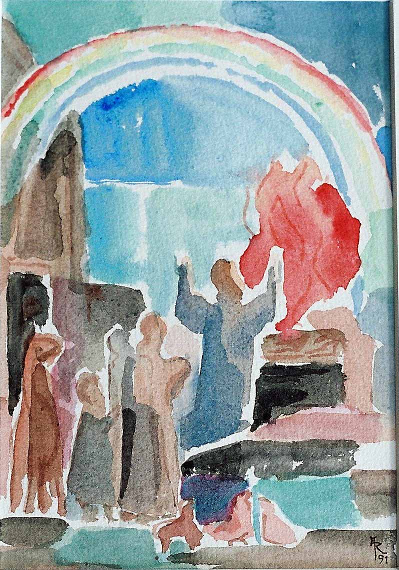Noahs Dankopfer für die Rettung. Mit dem Zeichen des Regenbogens schließt Gott einen neuen Bund mit Noah. Aquarell, 12 x 17 cm, 1991