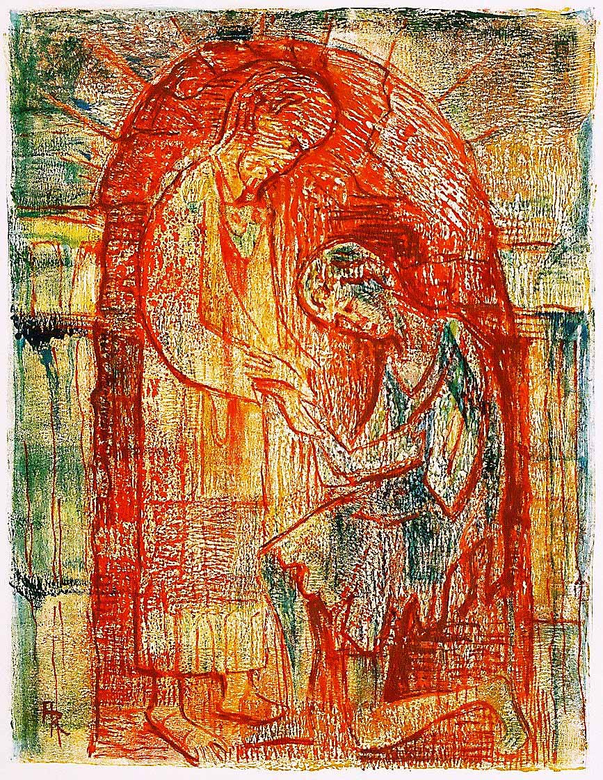 Der verlorene Sohn. Der Sohn bedauert sein Tun, kehrt heim und wird vom barmherzigen Vater wieder freudig aufgenommen. Monotypie