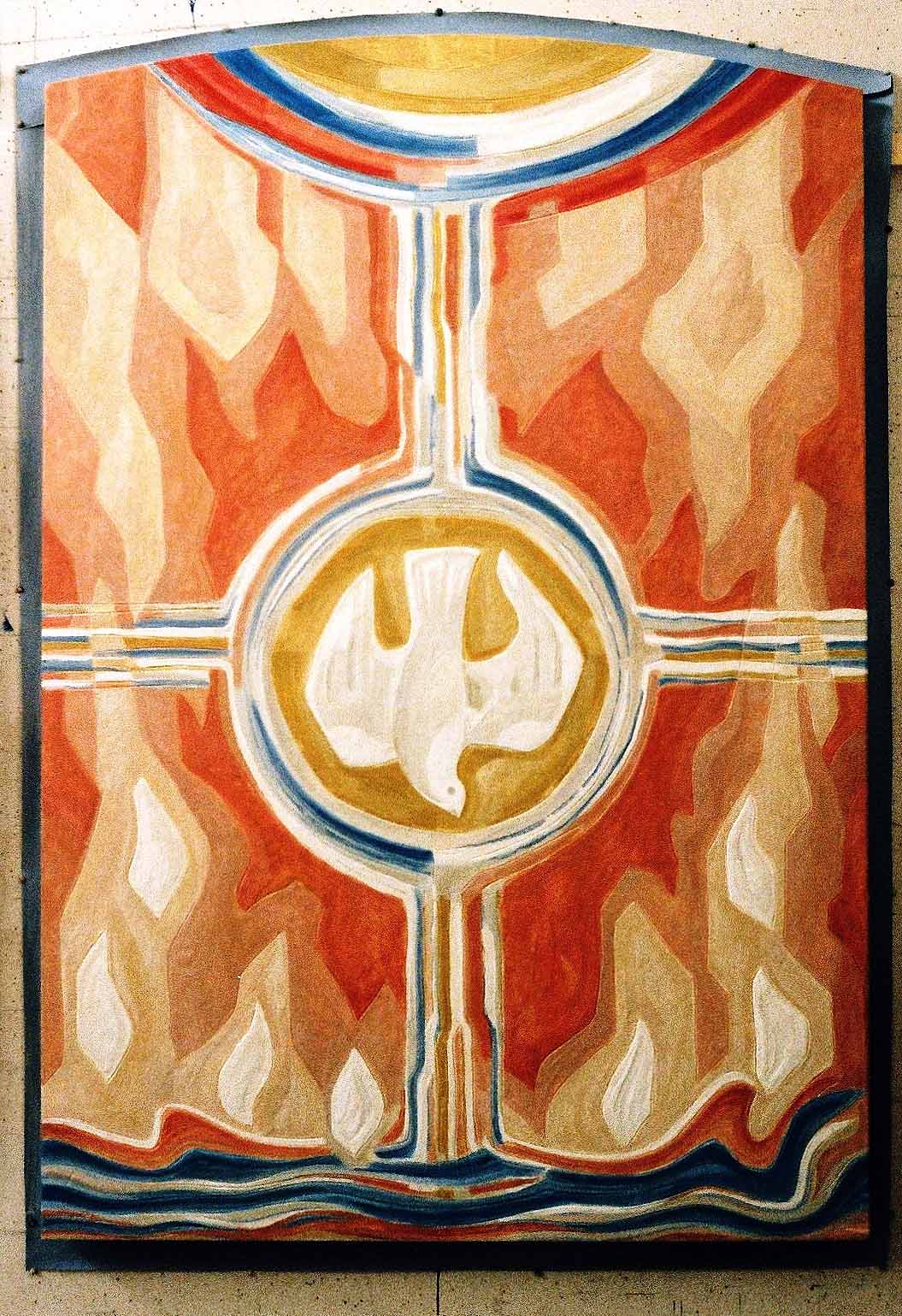 Wandmalerei am Taufstein in der St. Agatha–Kirche in Alverskirchen. Das fertige Werk in Acryl auf Spanplatte.