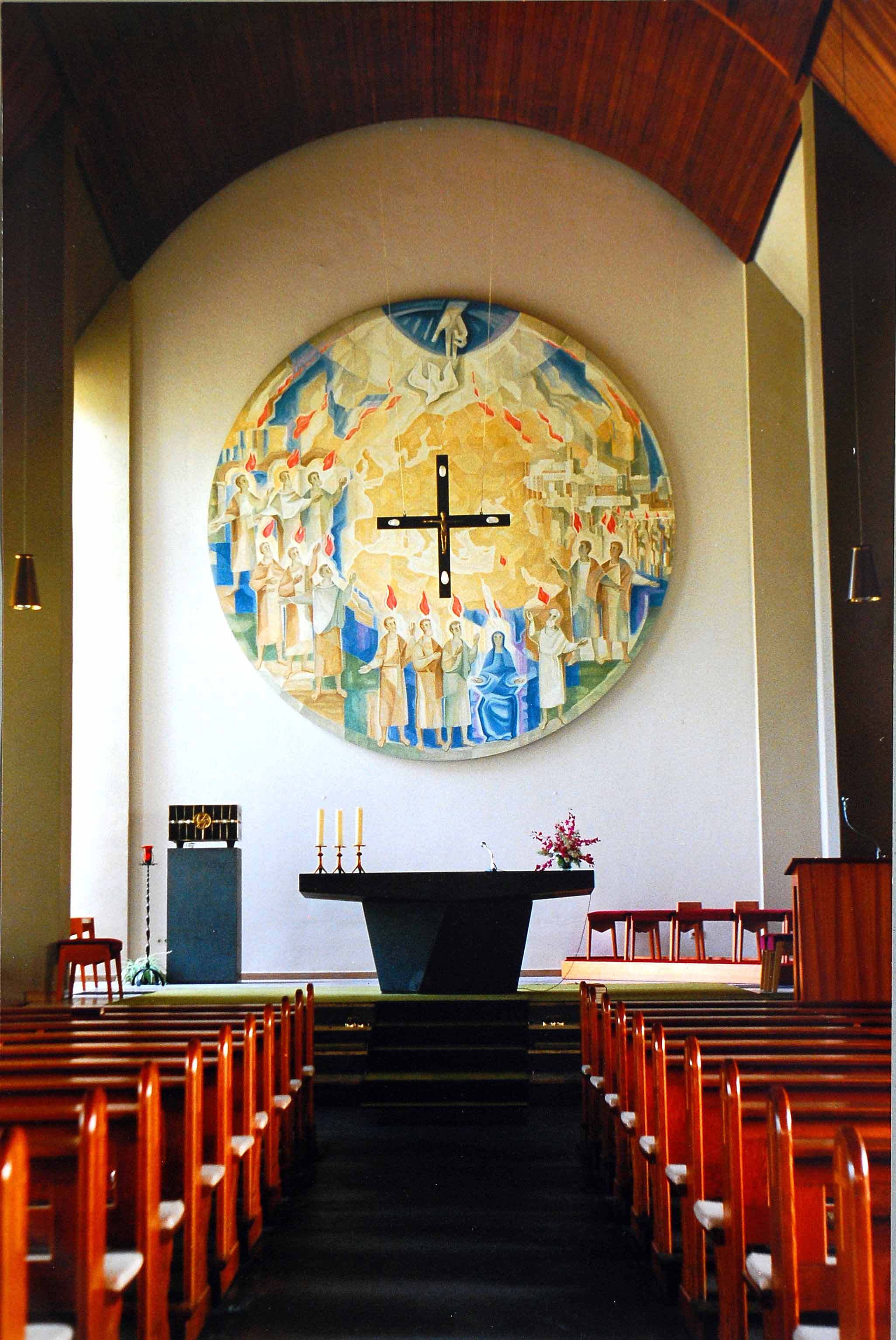 Wandmalerei im Chorraum der Kirche in Hamm–Heesen. Die Geist–Sendung. Acrylmalerei auf 4 cm starken Spanplatten, 6 Platten zum Kreis gefügt, Durchmesser 5,20 m.