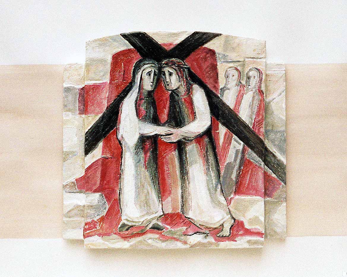 Kreuzweg in einem Altenheim in Hagen, IV. Station: Jesus begegnet seiner Mutter. Acrylmalerei mit sehr figürlicher Darstellungsweise auf versetzt angebrachten Holzplatten.