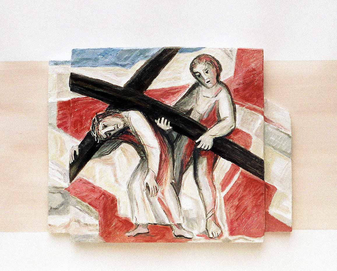 Kreuzweg in einem Altenheim in Hagen, V. Station: Simon von Cyrene hilft Jesus das Kreuz tragen. Acrylmalerei mit sehr figürlicher Darstellungsweise auf versetzt angebrachten Holzplatten.