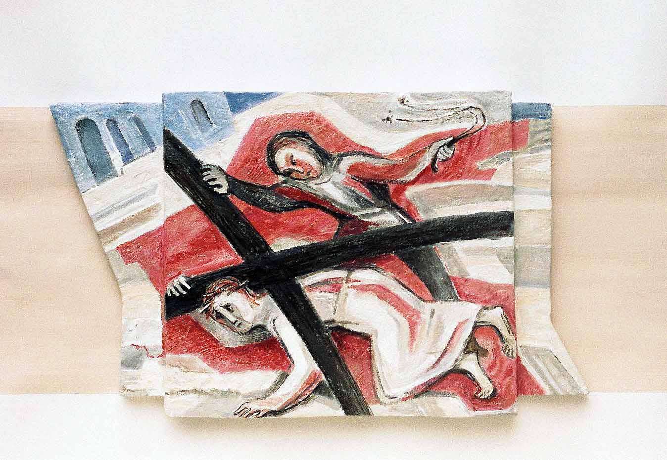 Kreuzweg in einem Altenheim in Hagen, VII. Station: Jesus fällt zum zweiten Mal unter dem Kreuz. Acrylmalerei mit sehr figürlicher Darstellungsweise auf versetzt angebrachten Holzplatten.