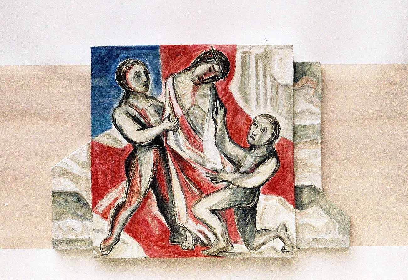 Kreuzweg in einem Altenheim in Hagen, X. Station: Jesus wird seiner Kleider beraubt. Acrylmalerei mit sehr figürlicher Darstellungsweise auf versetzt angebrachten Holzplatten.
