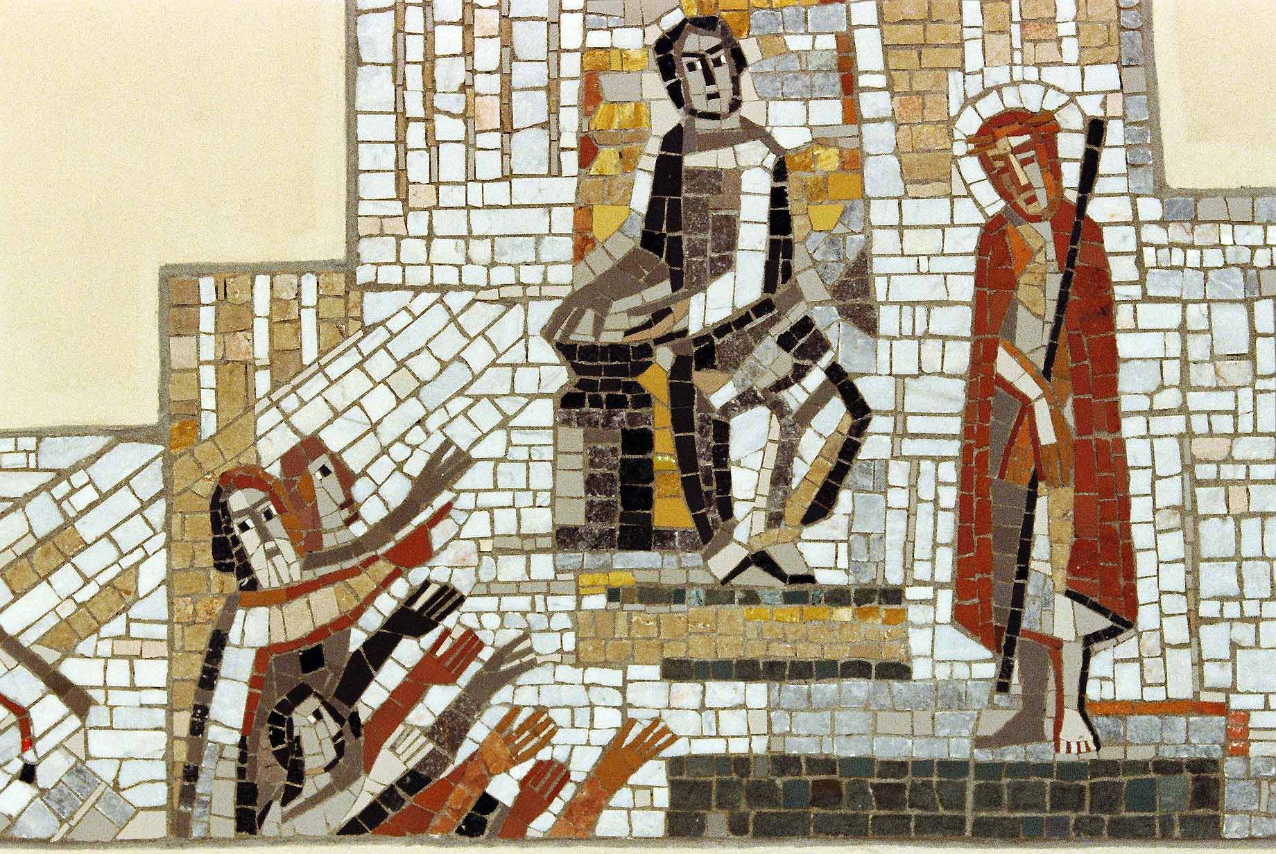 Die Kirche St. Wendelin in Elzach–Yach im Schwarzwald. Der Kreuzweg, I. Station: Jesus wird zum Tode verurteilt (Detail). Links Menschen, die anklagen und die Todesstrafe fordern. Mosaik–Arbeit, 1980