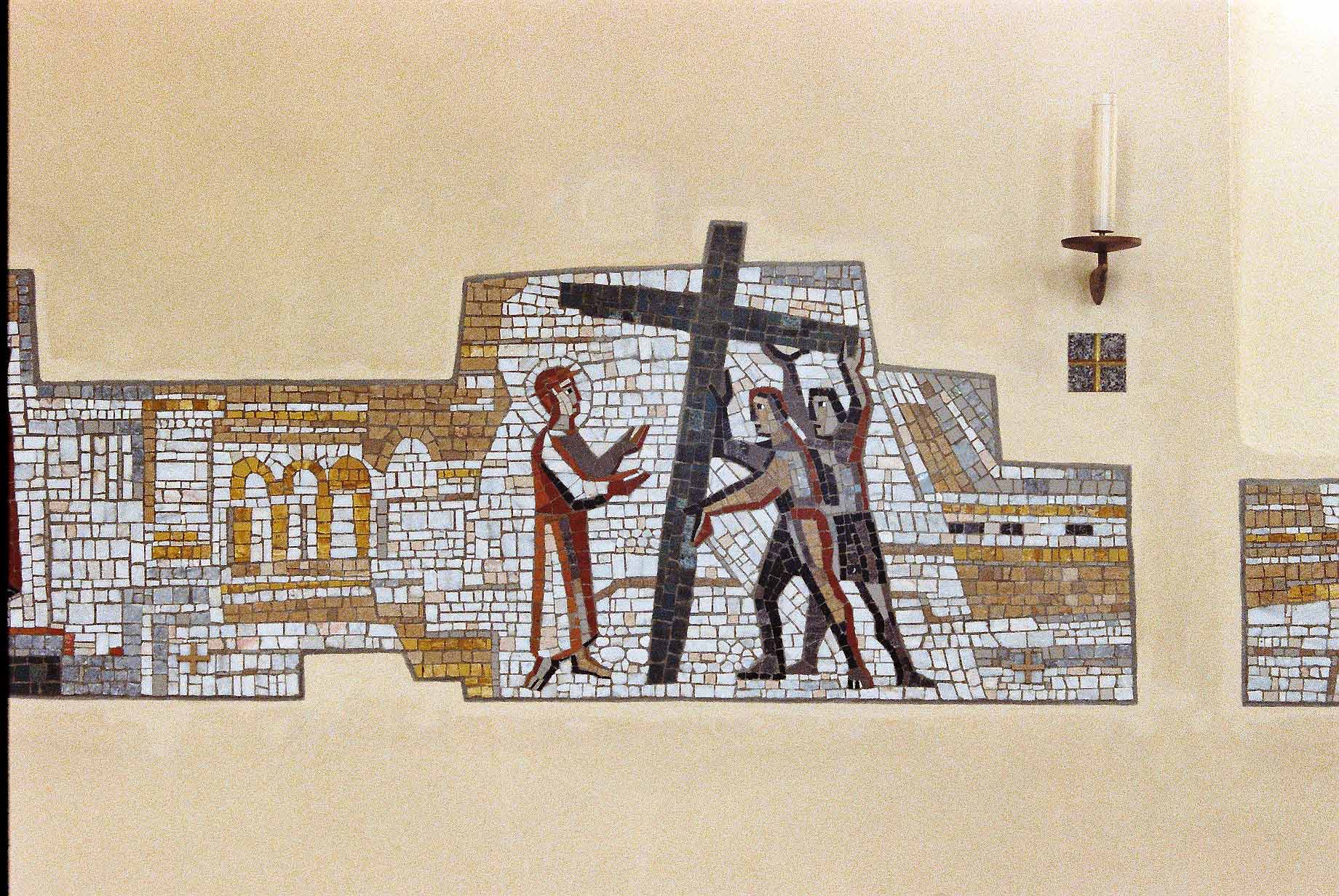 Die Kirche St. Wendelin in Elzach–Yach im Schwarzwald. Der Kreuzweg, II. Station: Jesus nimmt sein Kreuz auf sich. Der Kreuzweg wird als Weg mit Häusern und Toren, auf und ab verlaufend, dargestellt. Mosaik–Arbeit, 1980