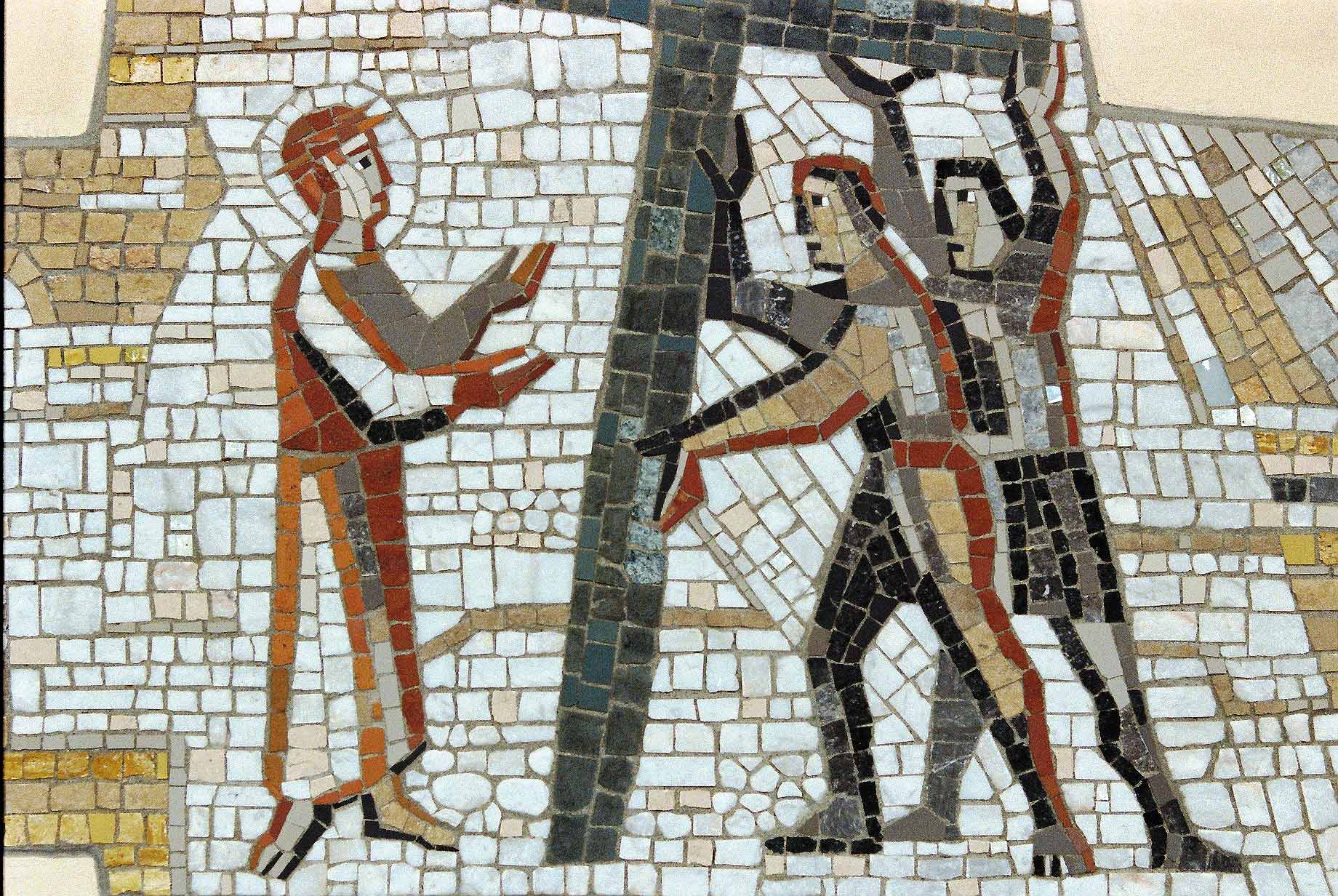 Die Kirche St. Wendelin in Elzach–Yach im Schwarzwald. Der Kreuzweg, II. Station: Jesus nimmt sein Kreuz auf sich (Detail). Der Kreuzweg wird als Weg mit Häusern und Toren, auf und ab verlaufend, dargestellt. Mosaik–Arbeit, 1980