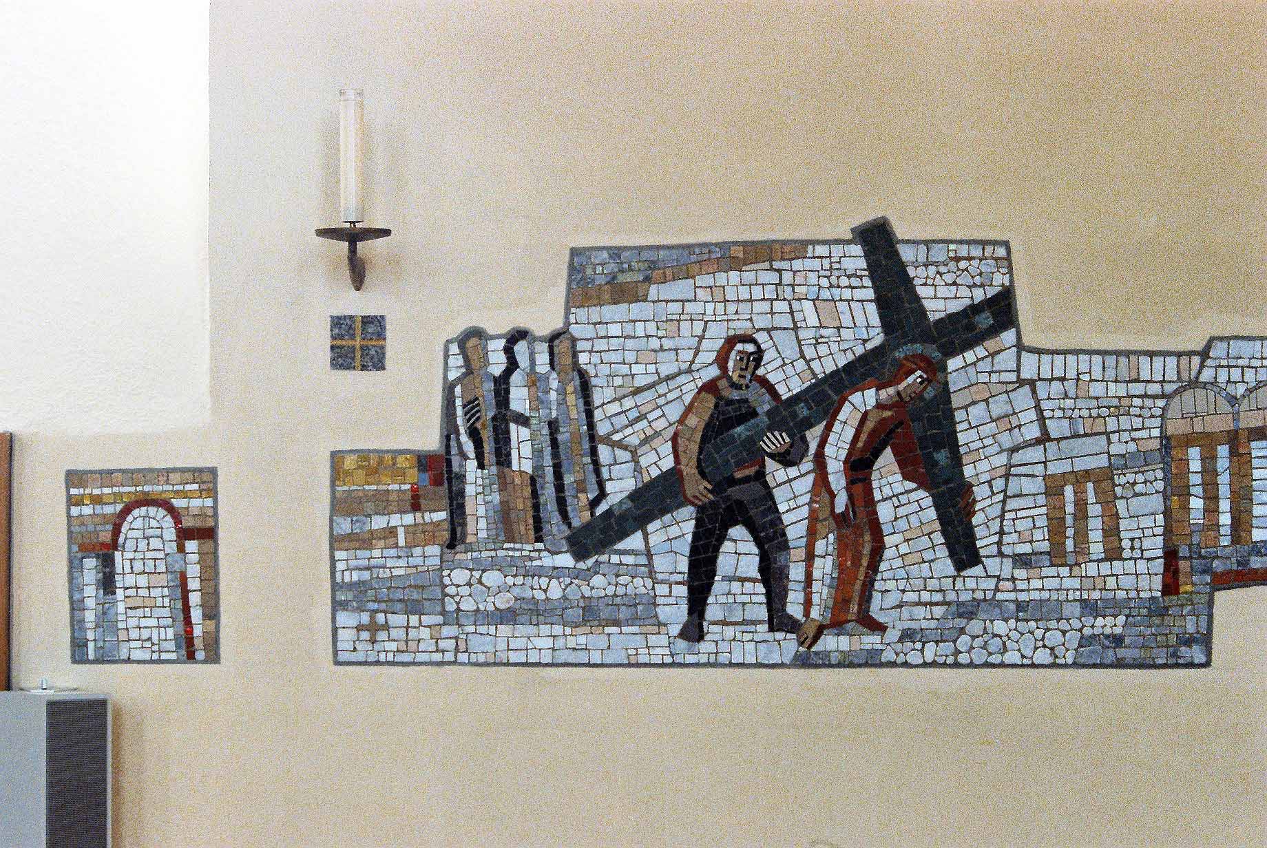 Die Kirche St. Wendelin in Elzach–Yach im Schwarzwald. Der Kreuzweg, V. Station: Simon von Cyrene hilft Jesus das Kreuz tragen. Mosaik–Arbeit, 1980