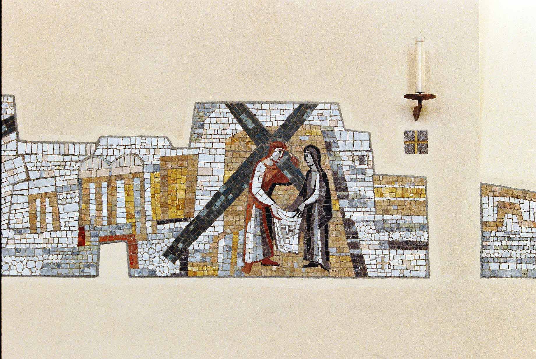 Die Kirche St. Wendelin in Elzach–Yach im Schwarzwald. Der Kreuzweg, VI. Station: Veronika reicht ihm das Schweißtuch. Mosaik–Arbeit, 1980