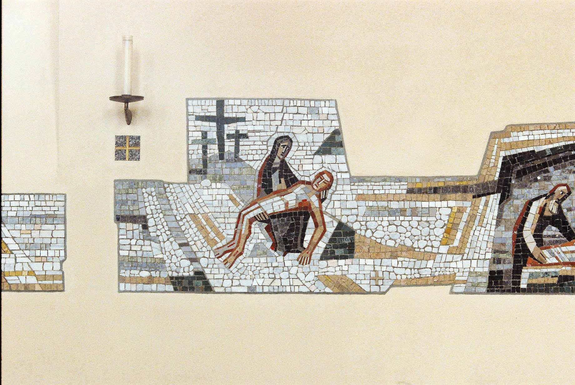 Die Kirche St. Wendelin in Elzach–Yach im Schwarzwald. Der Kreuzweg, XIII. Station: Jesus wird vom Kreuz abgenommen. (Dargestellt als Pieta). Mosaik–Arbeit, 1980