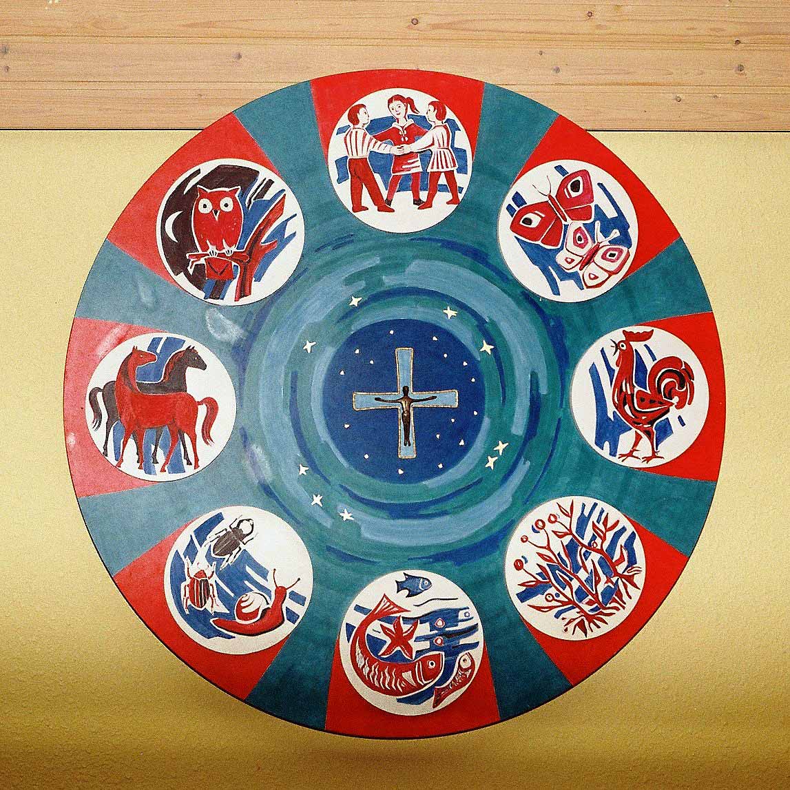 Die Weltscheibe für den St.–Vitus–Kindergarten in Everswinkel Acrylfarben auf Spanplatte mit 14 bemalten Scheiben mit Tier– und Naturmotiven