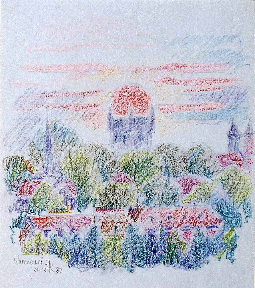 Sonnenuntergang hinter der Marienkirche in Warendorf (gesehen aus dem Krankenhaus in Warendorf) Farbstiftzeichnung
