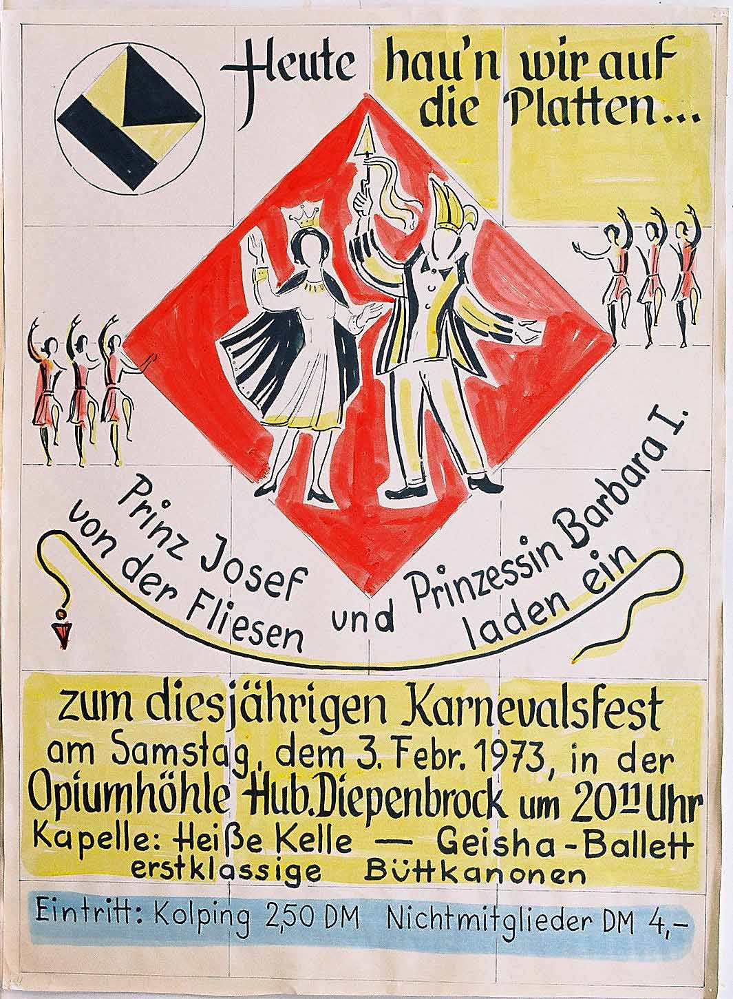 Plakat zum Kolping–Karnevalsfest am 03.02.1973 im Gasthof Diepenbrock mit dem Karnevals–Prinzenpaar Josef Wiedemann und Barbara Wiedemann. Lichtpause mit Tuschefarben koloriert, 1973, 61 x43 cm.