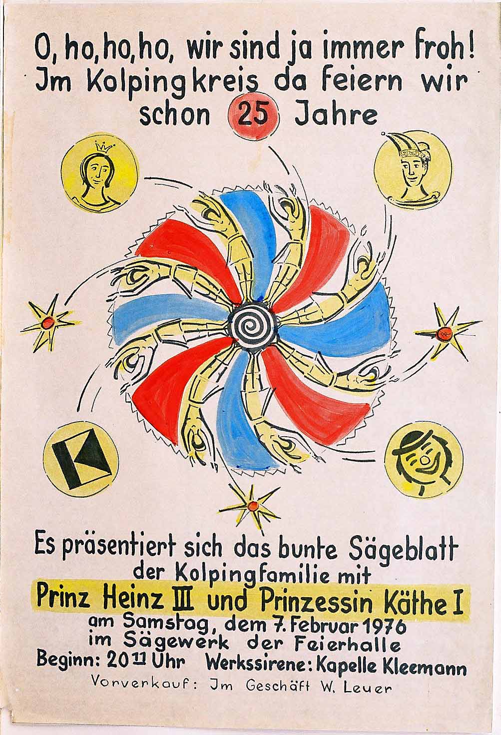 Plakat zum Kolping–Karnevalsfest am 07.02.1976 mit dem Karnevals–Prinzenpaar Heinz Bomkamp und Käthe Bomkamp. Lichtpause mit Tuschefarben koloriert, 1976, 61 x43 cm.