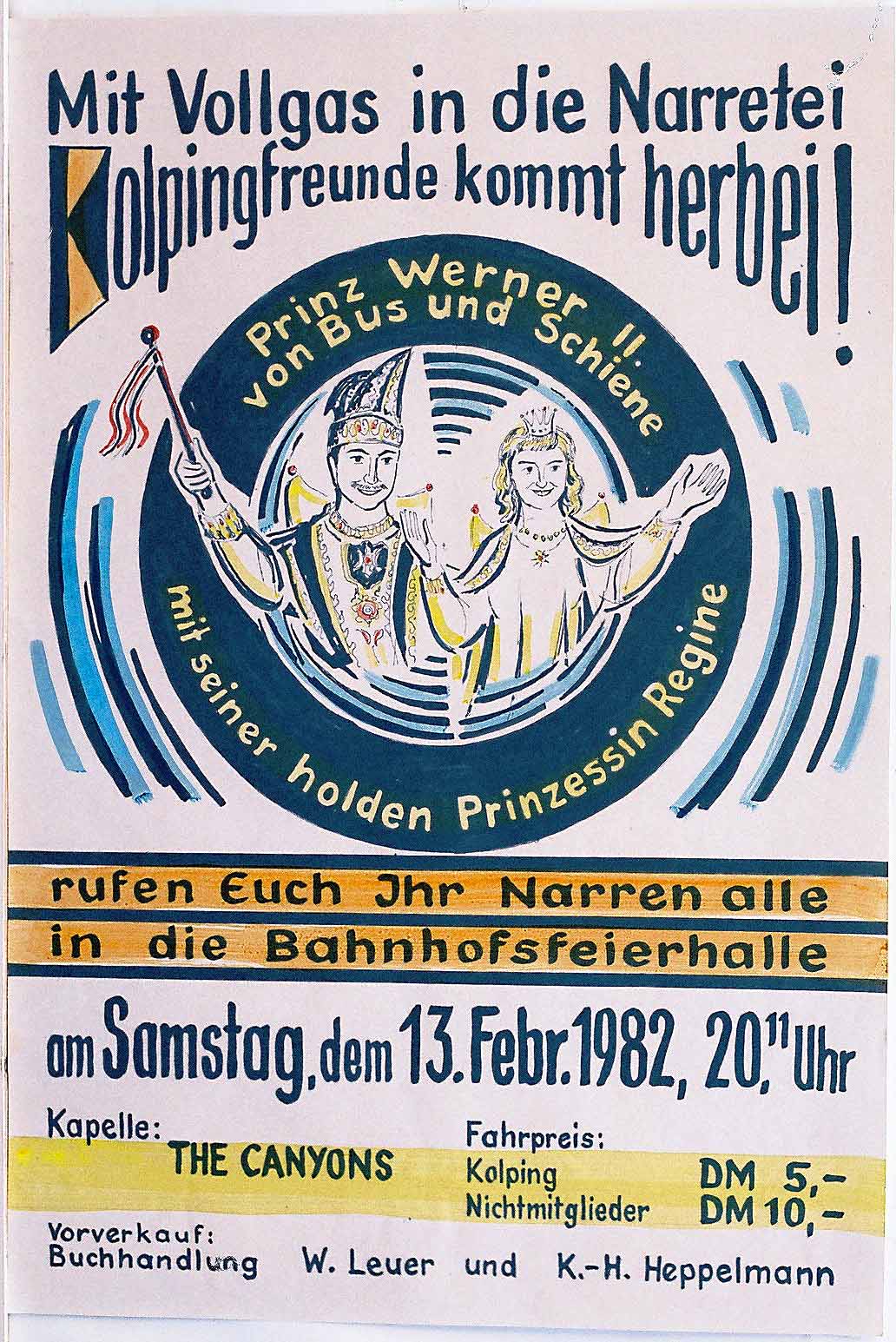 Plakat zum Kolping–Karnevalsfest am 13.02.1982 mit dem Karnevals–Prinzenpaar Werner Schniedermann und Regina Schniedermann. Lichtpause mit Tuschefarben koloriert, 1982, 61 x43 cm.