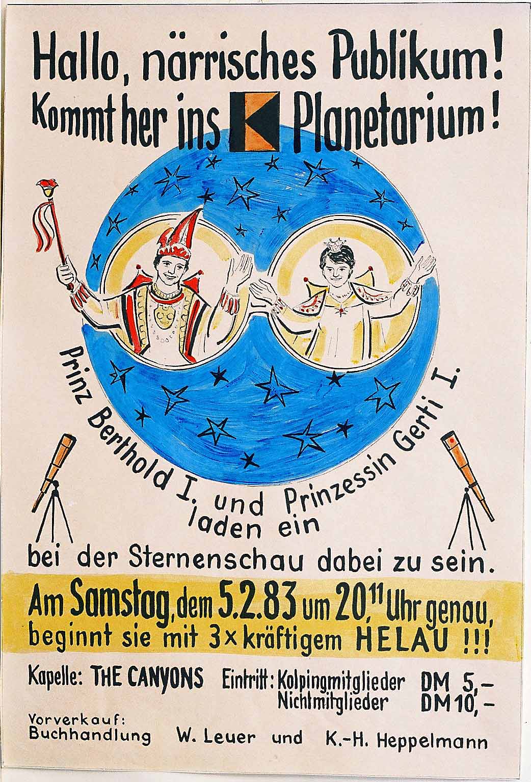 Plakat zum Kolping–Karnevalsfest am 05.02.1983 mit dem Karnevals–Prinzenpaar Berthold Schlief und Gerti Schlief. Lichtpause mit Tuschefarben koloriert, 1983, 61 x43 cm.