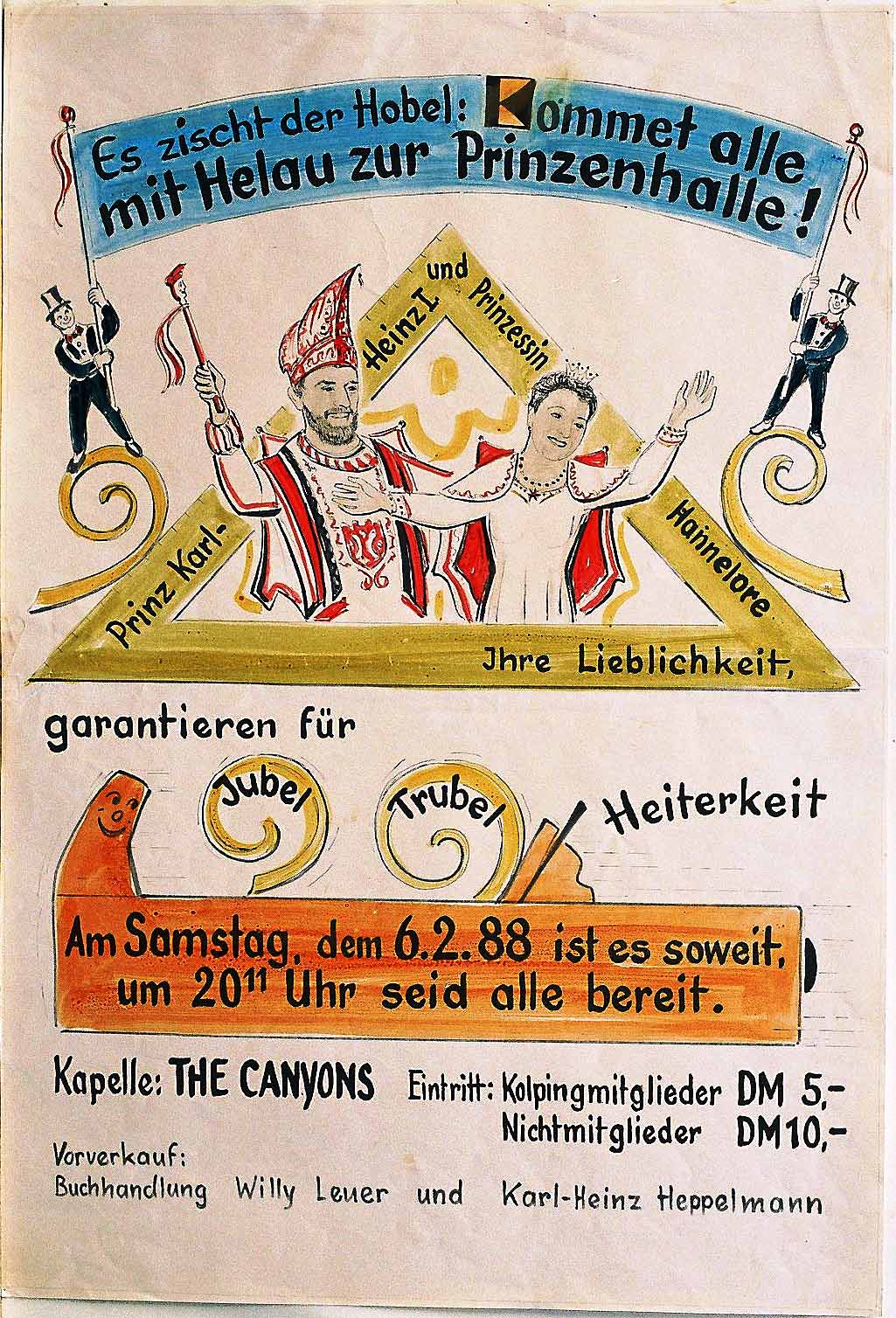 Plakat zum Kolping–Karnevalsfest am 06.02.1988 mit dem Karnevals–Prinzenpaar Karl–Heinz Ekel und Hannelore Ekel. Lichtpause mit Tuschefarben koloriert, 1988, 61 x43 cm.