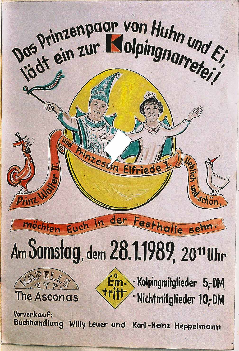 Plakat zum Kolping–Karnevalsfest am 28.01.1989 mit dem Karnevals–Prinzenpaar Walter Kröger und Elfriede Kröger. Lichtpause mit Tuschefarben koloriert, 1989, 61 x43 cm.