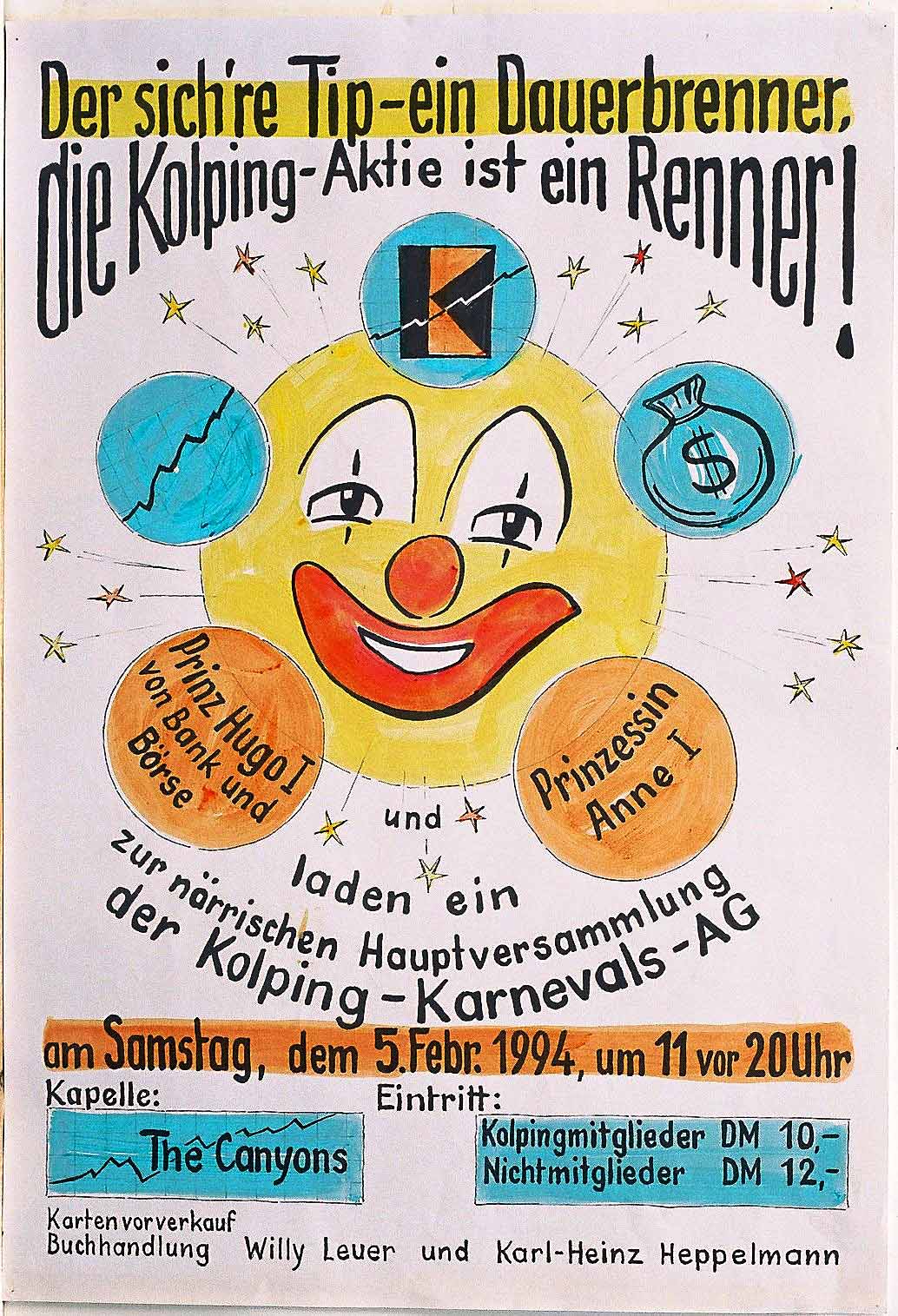 Plakat zum Kolping–Karnevalsfest am 05.02.1994 mit dem Karnevals–Prinzenpaar Hugo Stadtmann und Anne Stadtmann. Lichtpause mit Tuschefarben koloriert, 1994, 61 x43 cm.