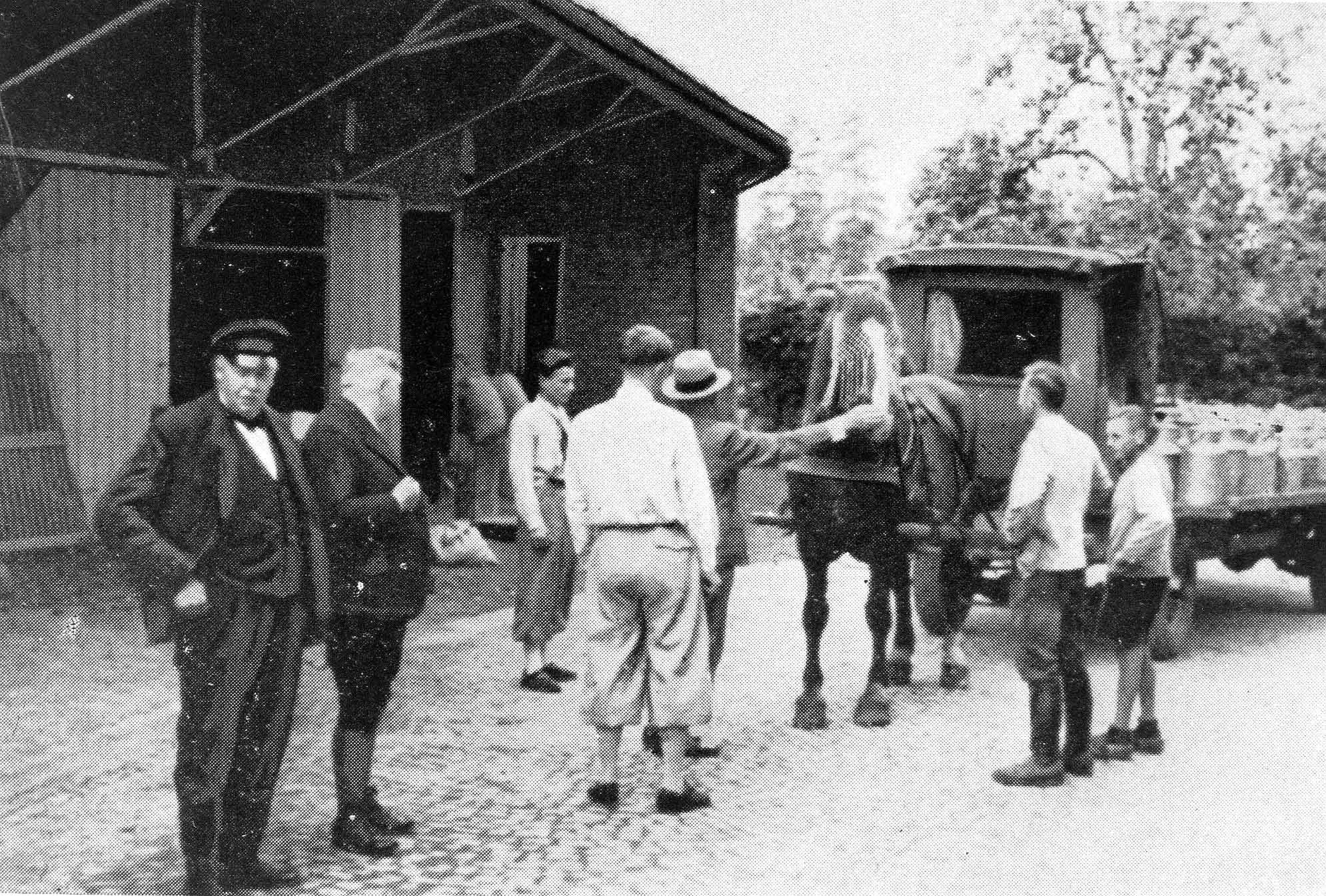 1935? : Anlieferung der Milch in Milchkannen mit Pferd und Wagen im Hofraum der Molev Personen von links: Josef Roberg, senior Eduard Roberg Heinrich Dollmann (ein Milchwagenfahrer aus Hoetmar)
