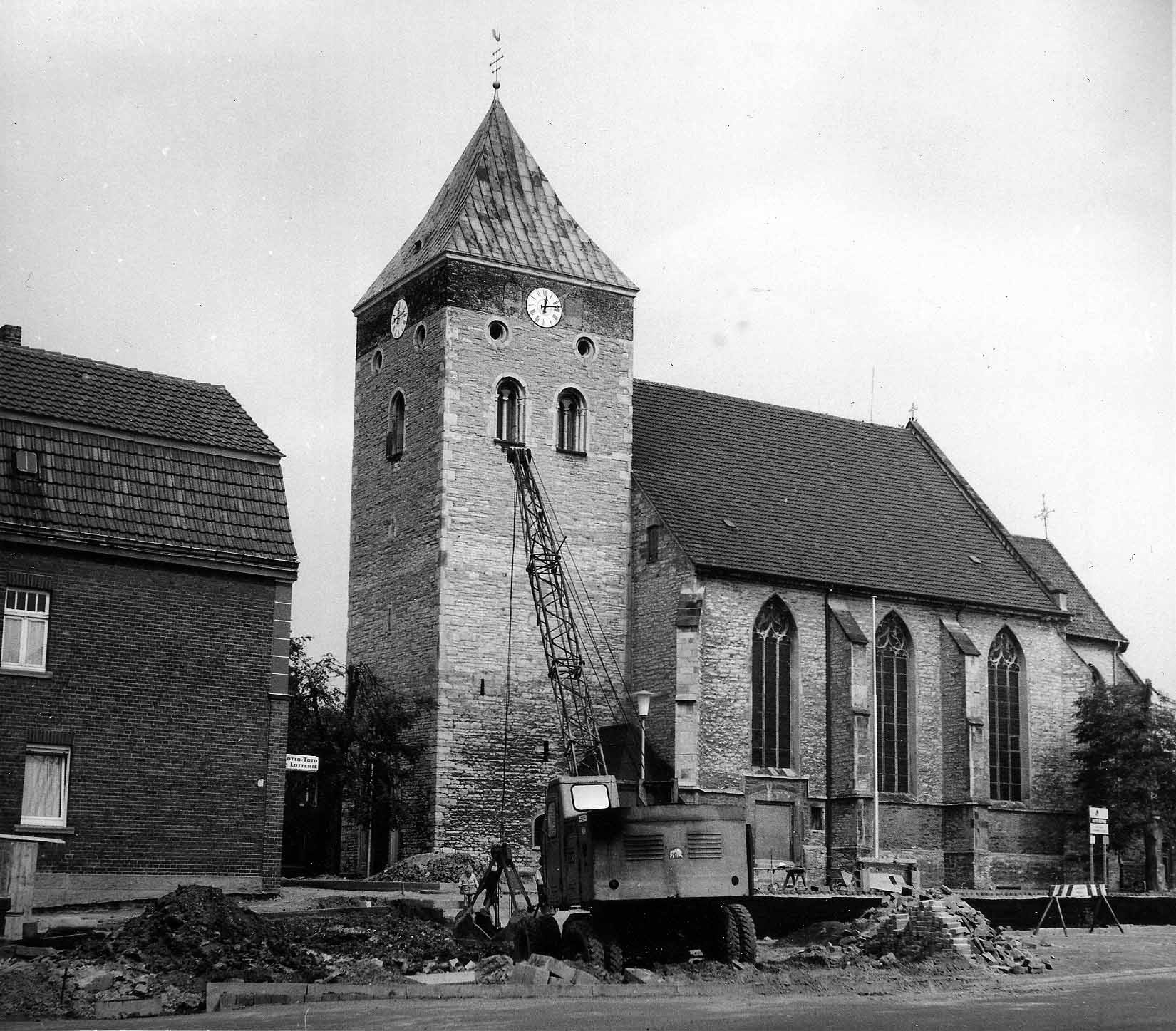 08.1967 : Bauarbeiten an der Kirchplatzmauer im August 1967 Das Denkmal des Bischofs Johann Bernhard Brinkmann fehlt. Es wurde später an der Ecke Vitusstraße/Nordstraße aufgestellt. Die Bäume auf dem Kirchplatz sind gestutzt.