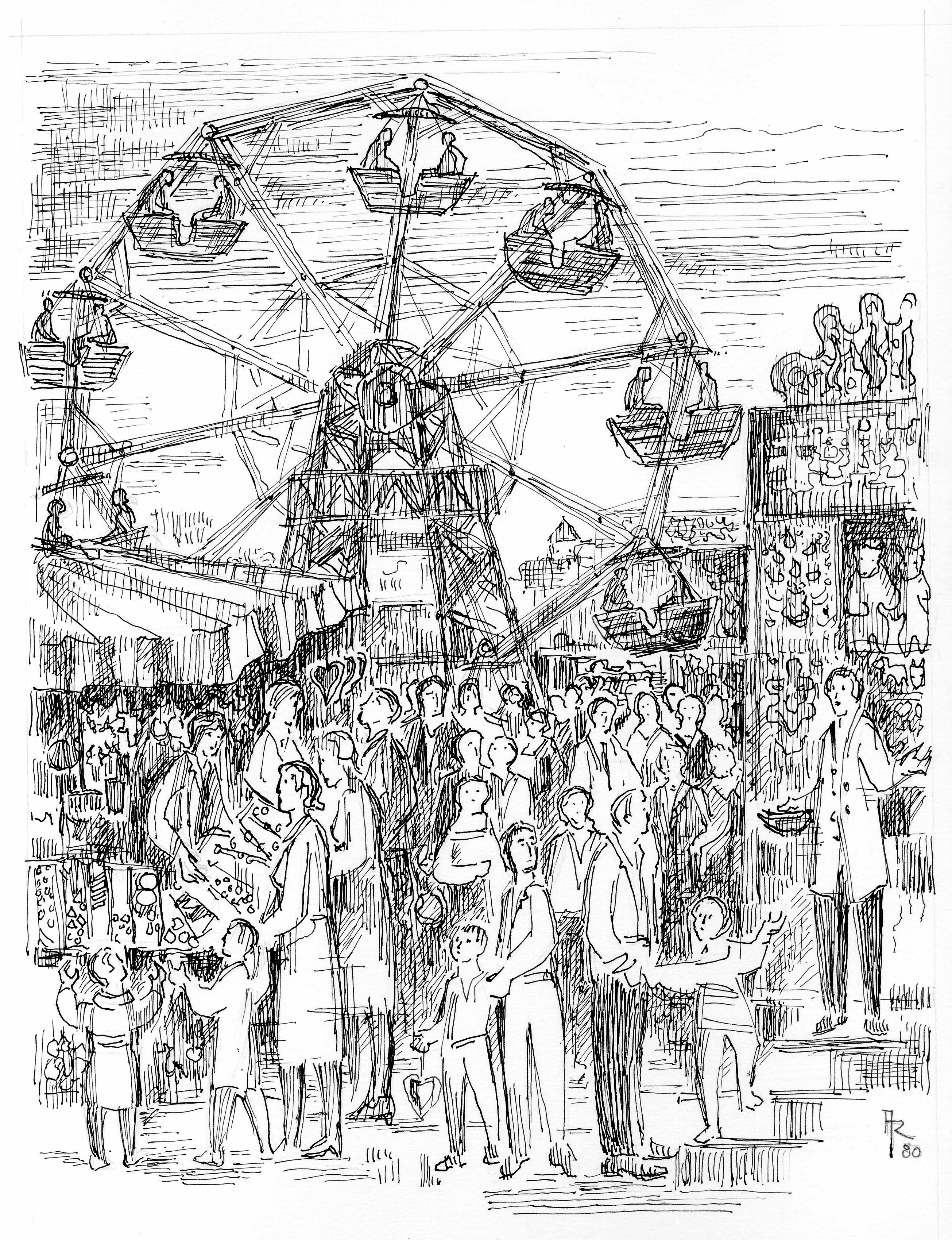 Die Vitus–Kirmes an der Bergstraße dargestellt mit Riesenrad und Verkaufsständen Federzeichnung, 1980